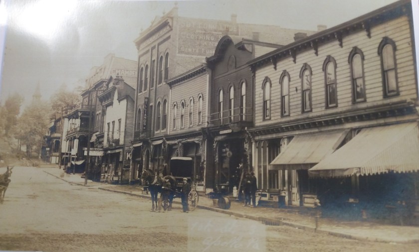 The historians noted that in the 1890s, this part of Apollo was a thriving commercial area, and the building’s features were typical of turn-of-the-century mercantile buildings. For instance, the Block Building has corner finials (distinctive ornaments at the top of a building), and the roofline still has an ornate cornice (the “crown molding” of a building), painted an ivory color in the modern photo above.