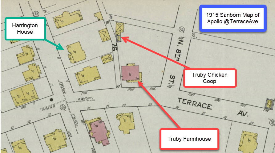 1915 map shows the location of the Truby farmhouse at 708 Terrace Ave in Apollo, where Clark Owens Truby lived with his father and son in 1921. Their backyard chicken coop abutted a narrow alley. Across the alley lived 25-year-old George Leslie Harrington, who had sent the threatening Black Hand letters to Truby and others.