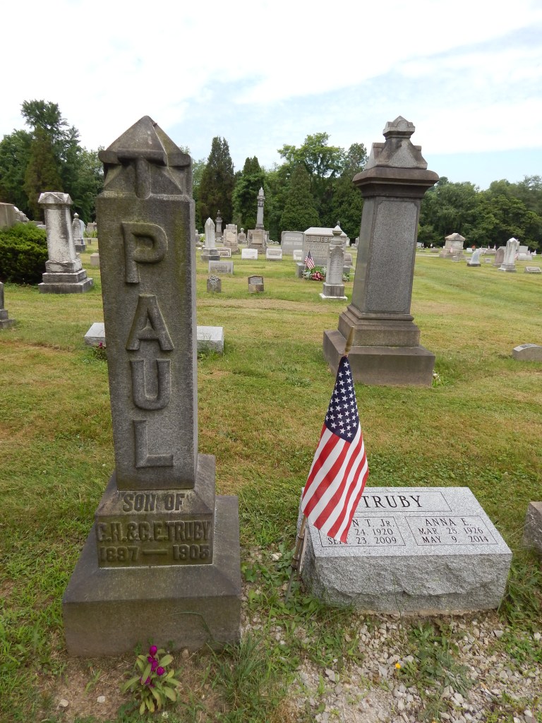 Grave of Paul Truby alongside a nephew whom he never lived to meet, Simon T Truby Jr and his wife Anna. Paul’s tombstone reads: Paul. Son of C.H. & C. E. Truby. 1887-1905. Photo by VL Contie, 2014