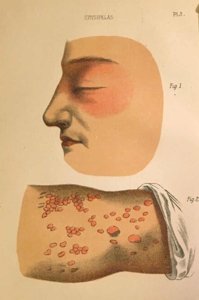 A popular medical book from 1885 shows typical rashes caused by erysipelas. The book notes: “The face is the most frequent seat of the disease. It commonly begins on one side of the nose, and soon spreads over one side of the face, closing up the eye, and changing the features in a shocking manner. See Plate III, Fig. 1.”