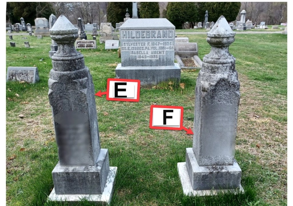 The six graves below are marked with letters A to F, and grave text is blurred out. Scroll down to see brief bios of six Simon Truby descendants, and click on quiz links to guess who might be in what grave, based on what you see.